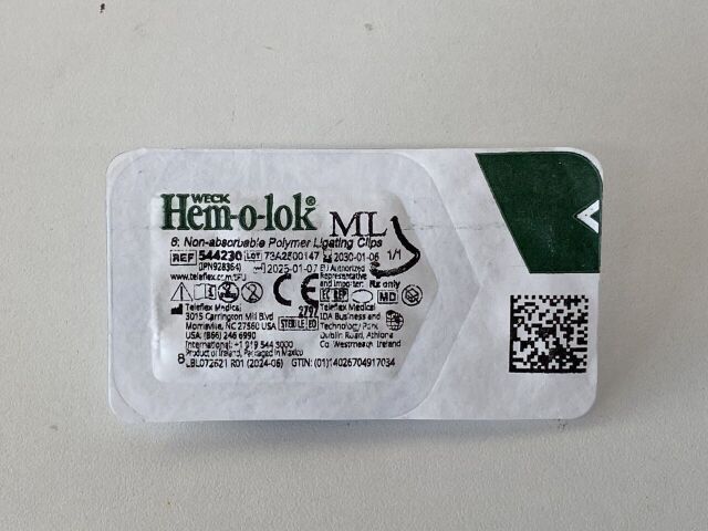 El Teleflex Weck Hem-o-lok® Polymer Ligating Clip Medium-Large – Ref. 544230 es un clip quirúrgico de polímero diseñado para ligar vasos sanguíneos y estructuras tubulares durante procedimientos quirúrgicos abiertos o laparoscópicos. Forma parte del sistema de ligadura Hem-o-lok®, ampliamente utilizado en cirugía moderna por su seguridad, facilidad de aplicación y confiabilidad.